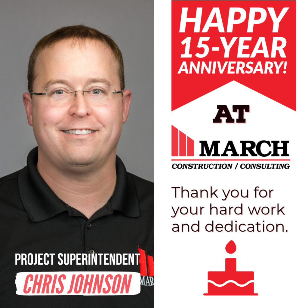 Happy Anniversary to our Project Superintendent Chris Johnson for 15-Years at March Construction!! Sincerely, The March Team To say some congratulatory words to Chris, comment beneath the graphic below.