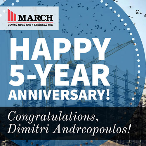 March Associates Construction would like to recognize Dimitri Andreopoulos for his 5 years of service. Dimitri is a valued member of the March Team and we appreciate his hard work and dedication. Congratulations Dimitri!