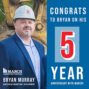 Congrats to Bryan for his five years of service with March Construction as Director of Marketing/ Development! Cheers!! Congrats to Bryan! Marketing Director Bryan Murray’s 5 Year Anniversary at March Construction
