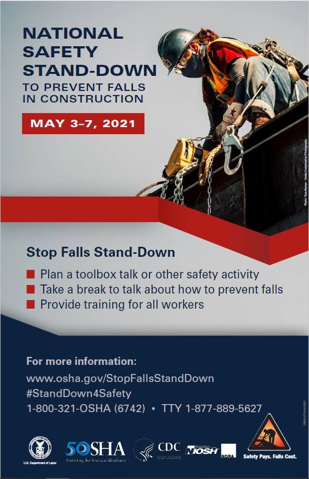 The OSHA National Safety Stand-Down is an opportunity for employers to talk directly to employees about safety. March honored the event this year from May 3rd to May 7th at several different jobsites.