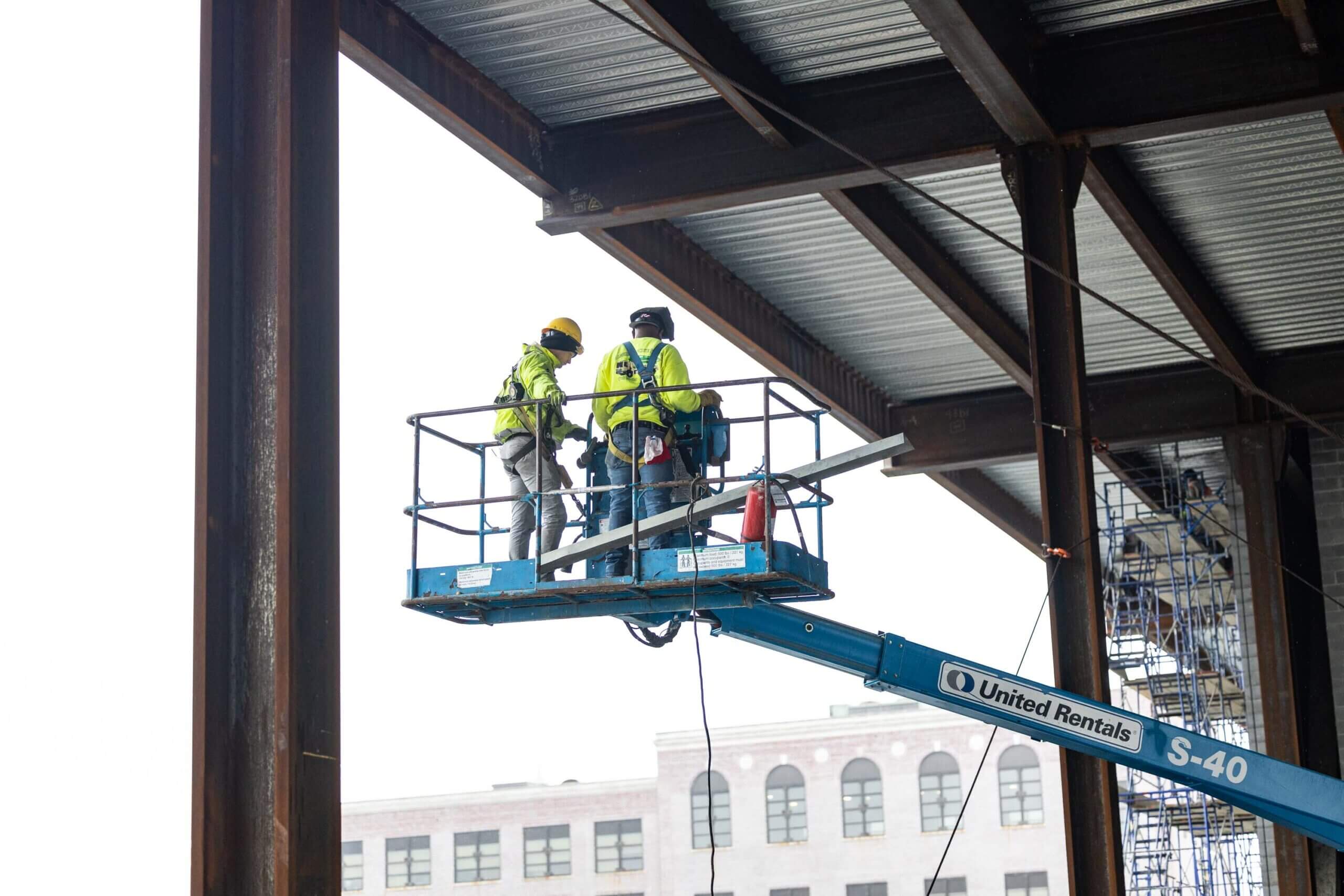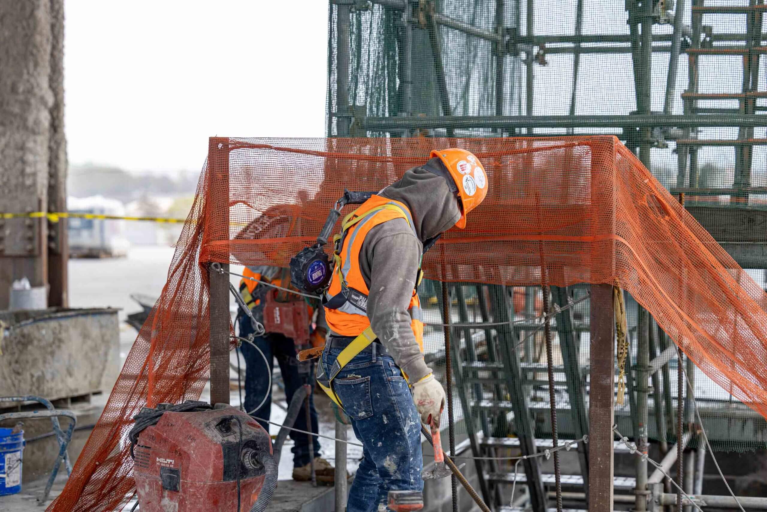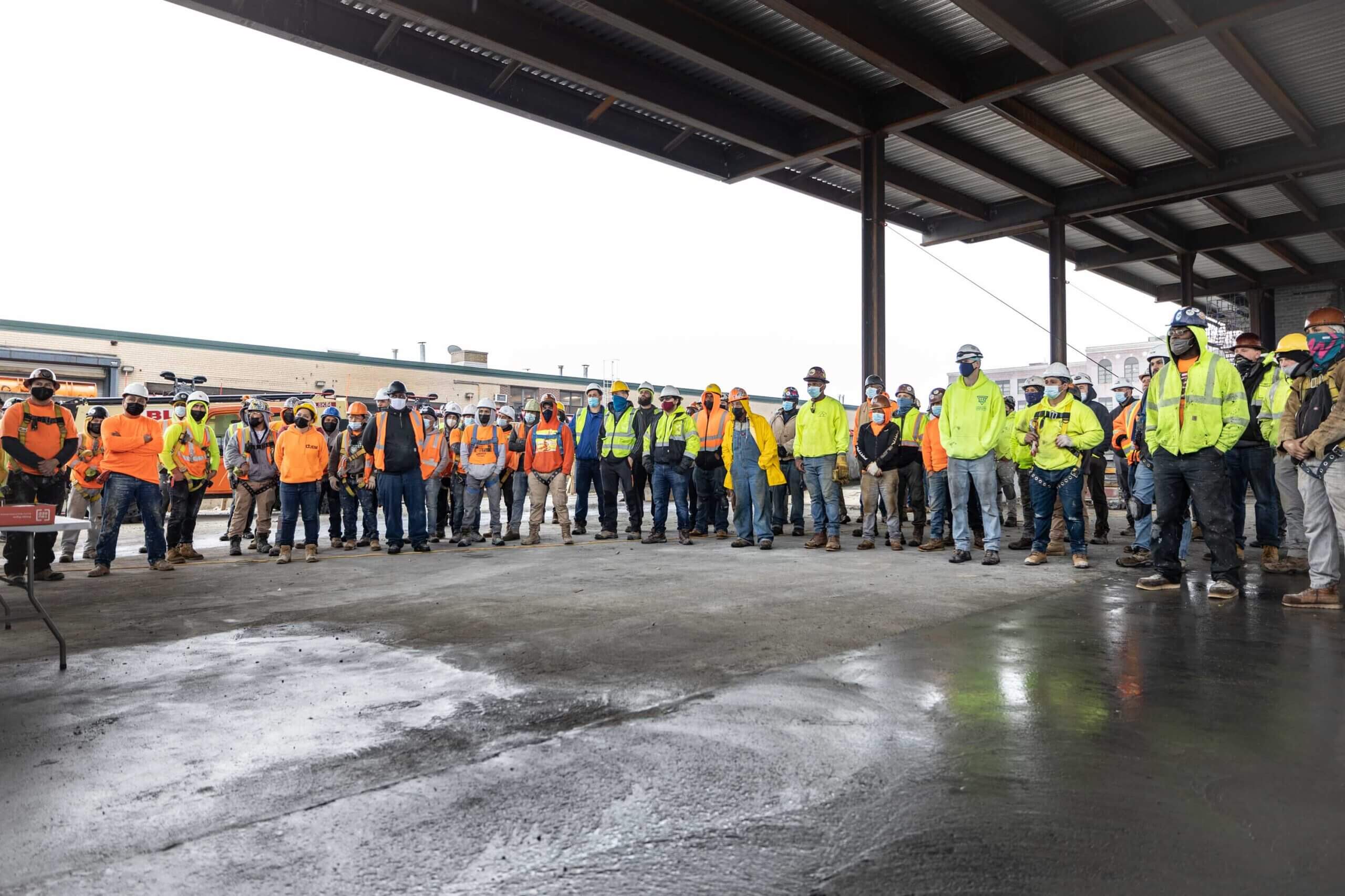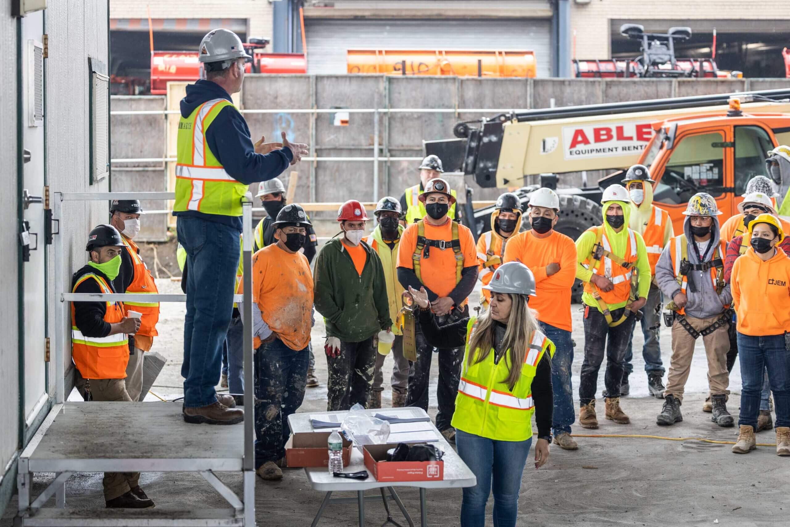 Our Safety Director Frank Brady and Field Operator Leila Stephan gathered workers together to refresh them on the safe use of ladders, scaffolds, aerial lifts, and harnesses. This meeting was held with Jim O’Sullivan and Carlos Paredes of Total Safety.