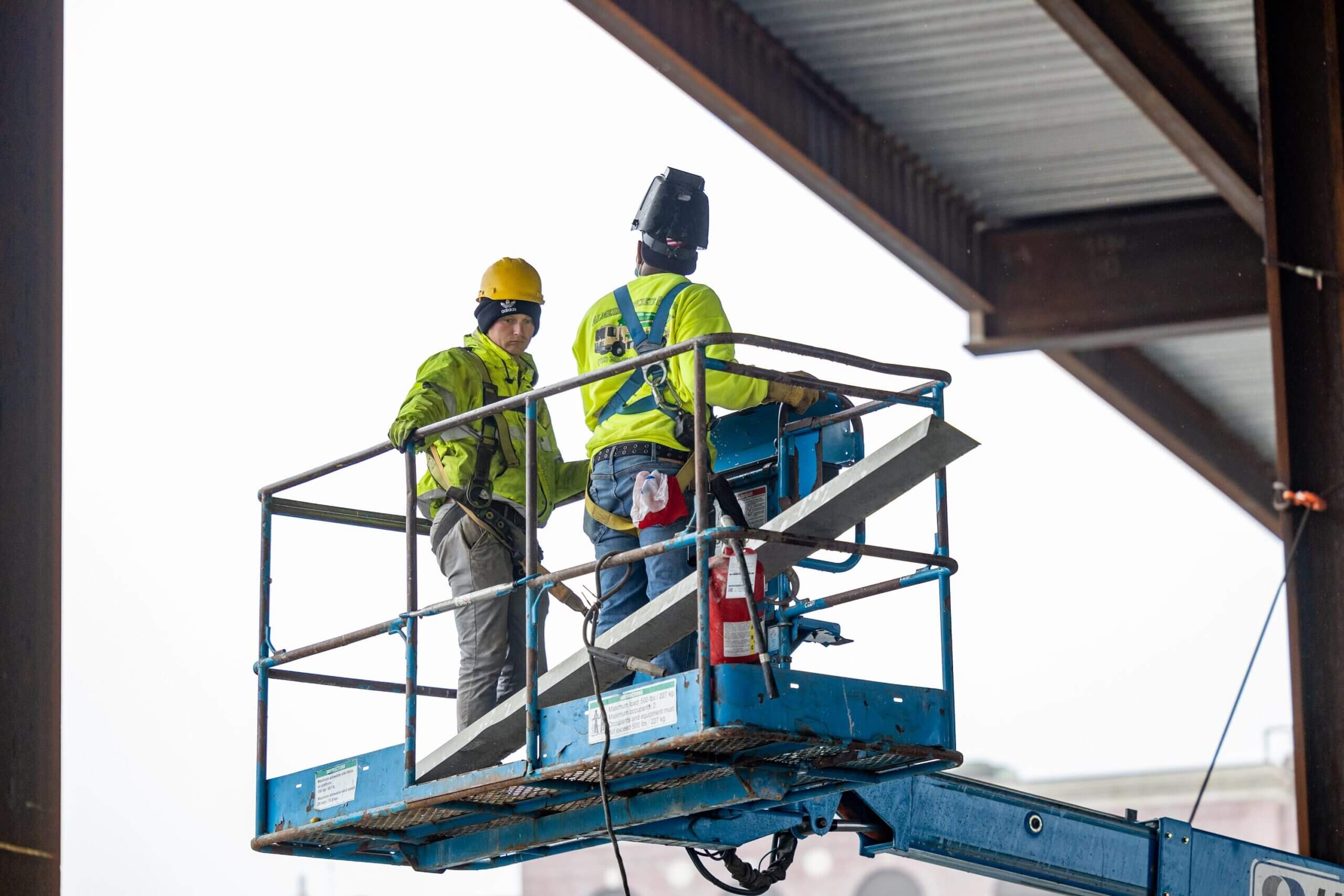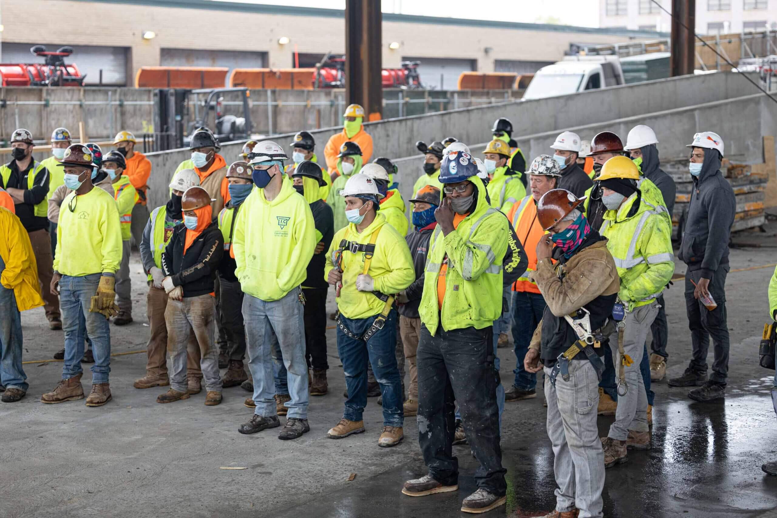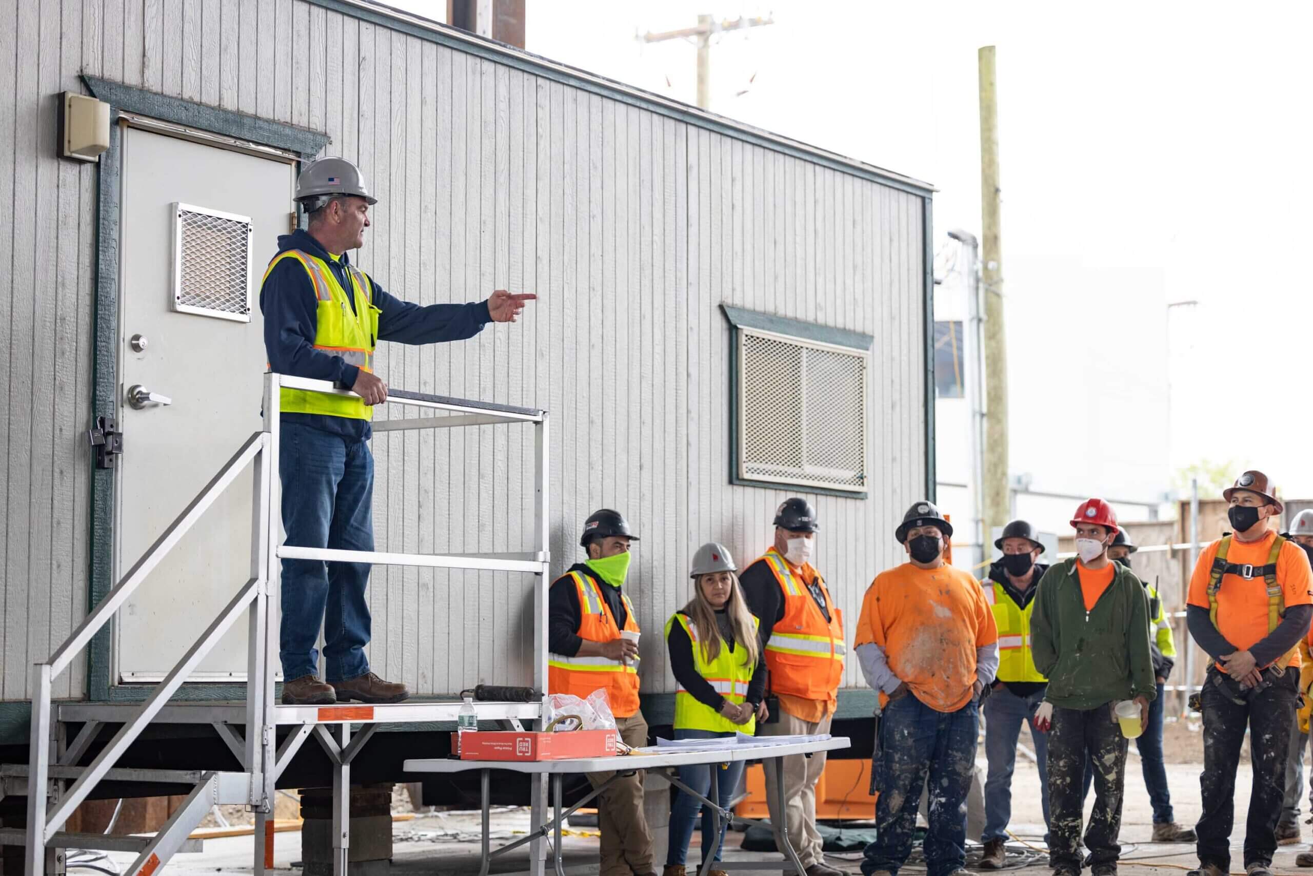 Our Safety Director Frank Brady and Field Operator Leila Stephan gathered workers together to refresh them on the safe use of ladders, scaffolds, aerial lifts, and harnesses. This meeting was held with Jim O’Sullivan and Carlos Paredes of Total Safety.