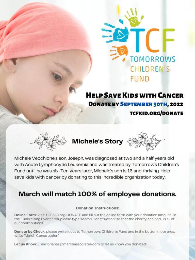 Join the movement: Donate now and make a difference. Help March reach our goal of $5,000. Michele Vecchione’s son, Joseph, was diagnosed at two and a half years old with Acute Lymphocytic Leukemia and was treated by Tomorrows Children’s Fund until he was six. Ten years later, Michele’s son is 16 and thriving. Help save kids with cancer by donating to this incredible organization today.