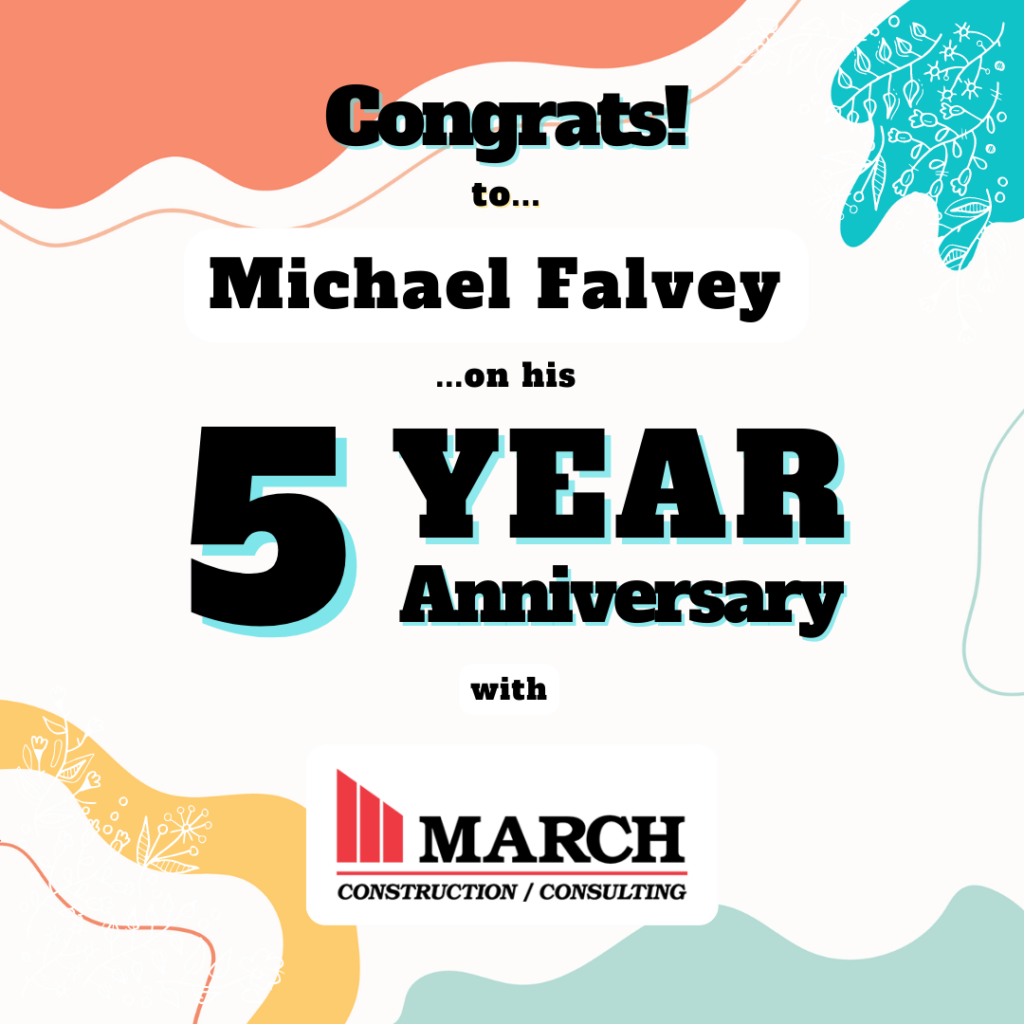 March Associates Construction would like to congratulate and recognize Michael Falvey for his 5 years of service with the company! Michael is a valued member of the March Team and we appreciate his hard work and dedication to the company!